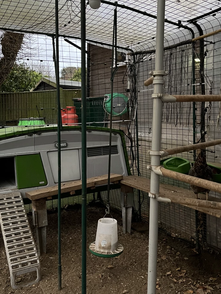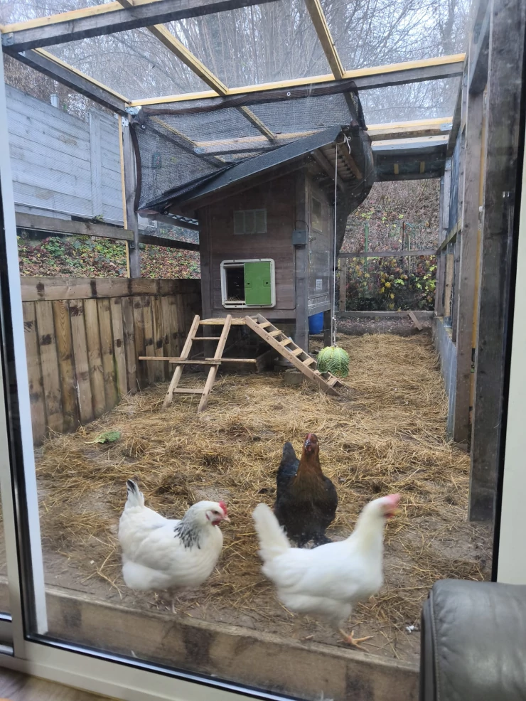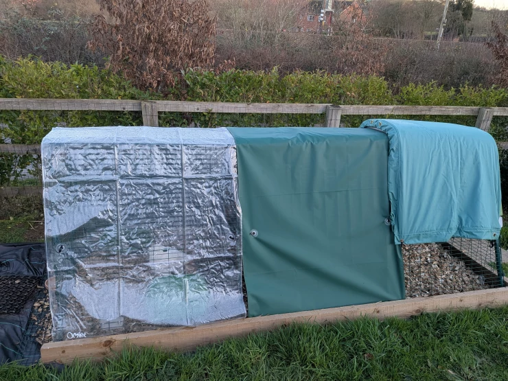 Légende : La maison de vacances en liberté de red, recouverte d'un des nombreux accessoires de Omlet"heavy duty tarp", à quelques pas de son Omlet Eglu Go up.
