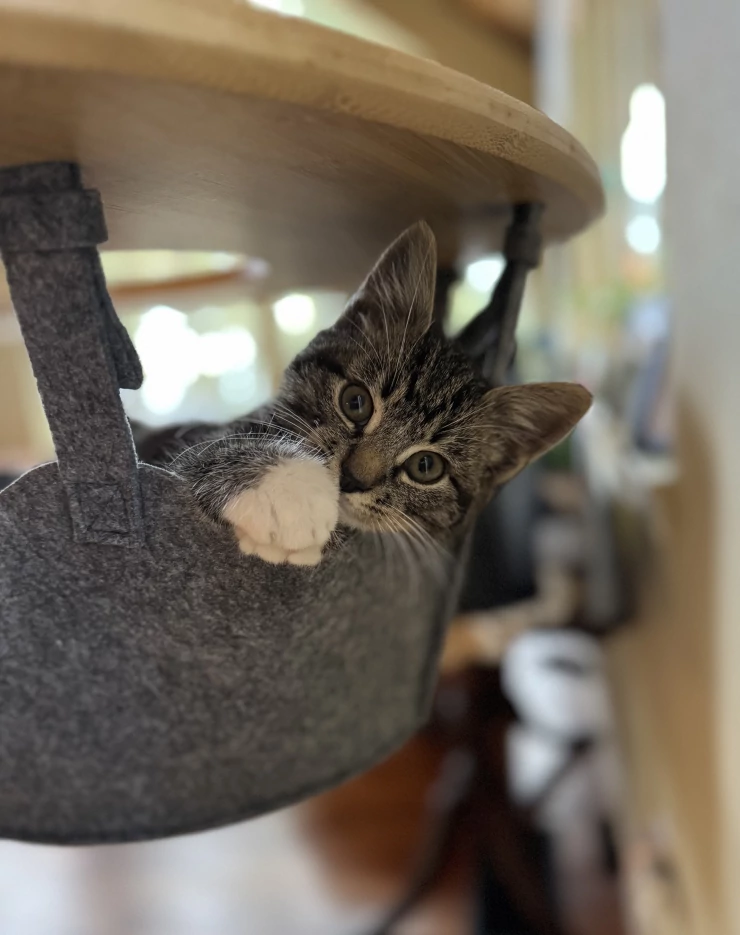 Légende : Chaton d'accueil aimant le panier de l'arbre à chat