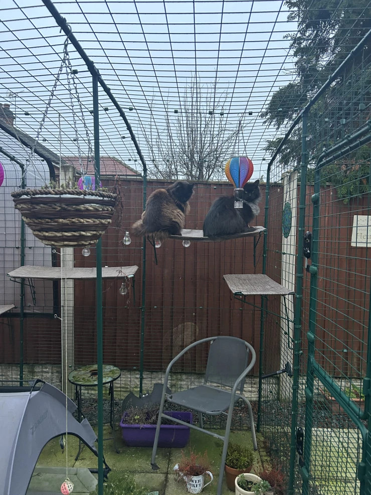 Légende : Mes deux maine coons testent la limite de poids des étagères du catio !