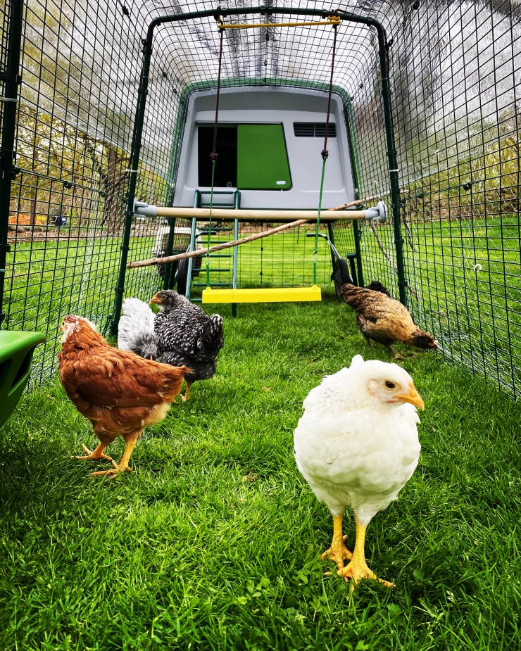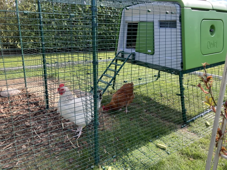 Légende : Des poulets heureux qui se promènent dans leur maison Omlet Cube