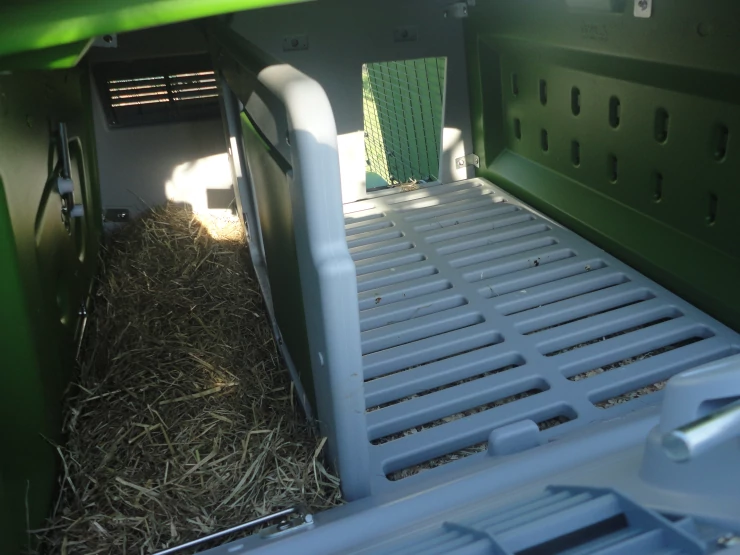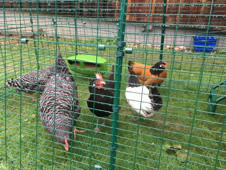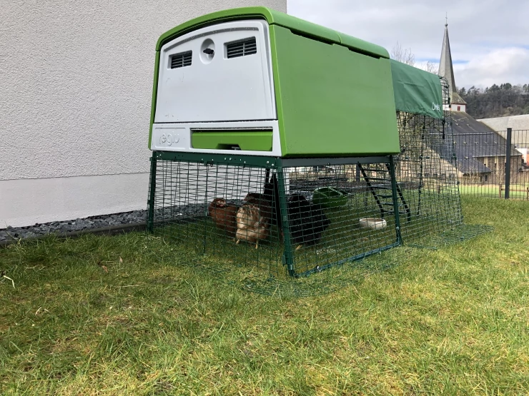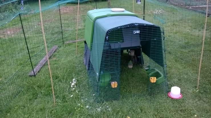 Légende : Poule sortant de Omlet vert Eglu Cube grand poulailler et parcours