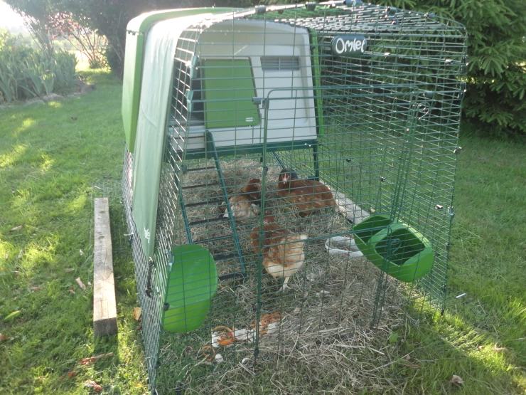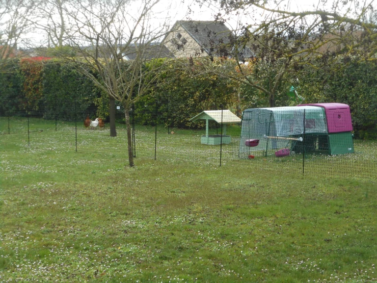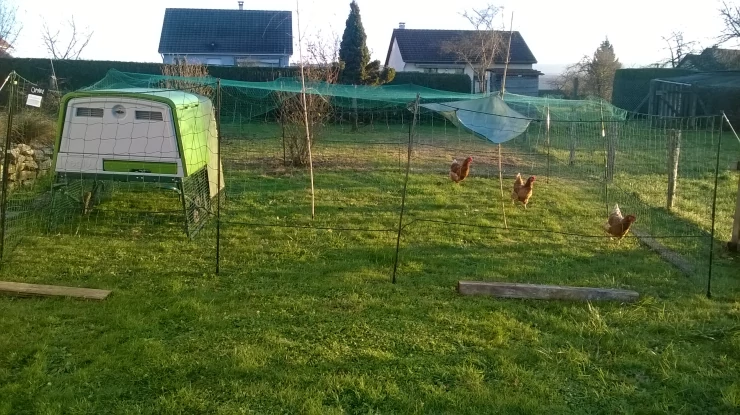 Légende : Omlet vert Eglu Cube grand poulailler et parcours avec poules