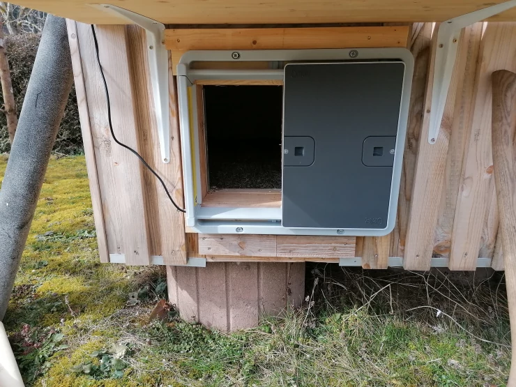 Légende : Omlet porte de poulailler automatique grise fixée au poulailler en bois