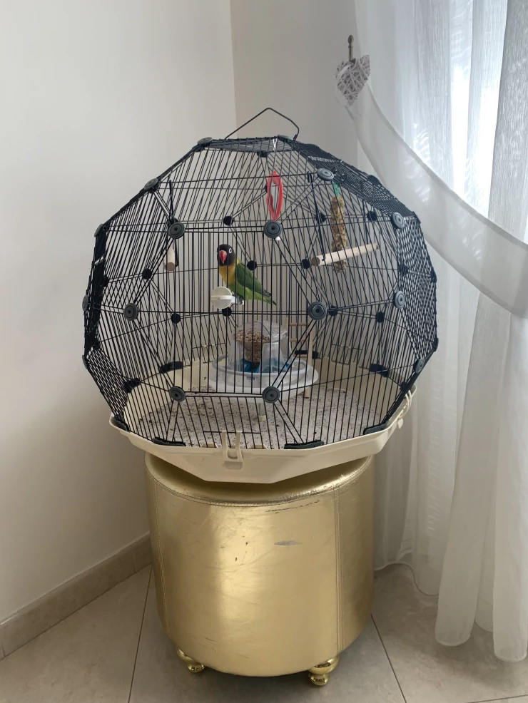 Légende : Omlet Geo cage à oiseaux avec cage noire et base crème